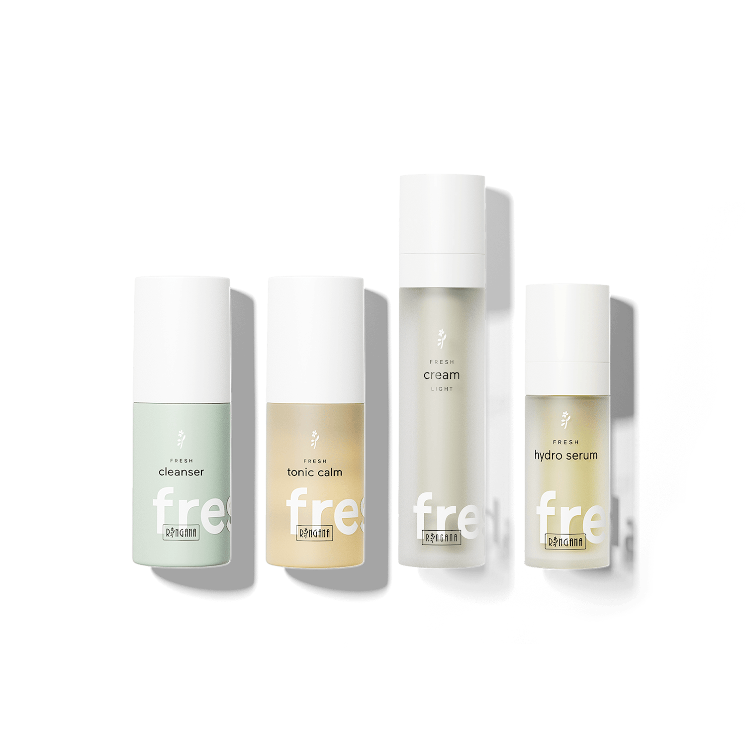 El set consta de: FRESH cleanser (125 ml), FRESH tonic calm (125 ml), FRESH hydro serum (30 ml), FRESH cream light (50 ml).